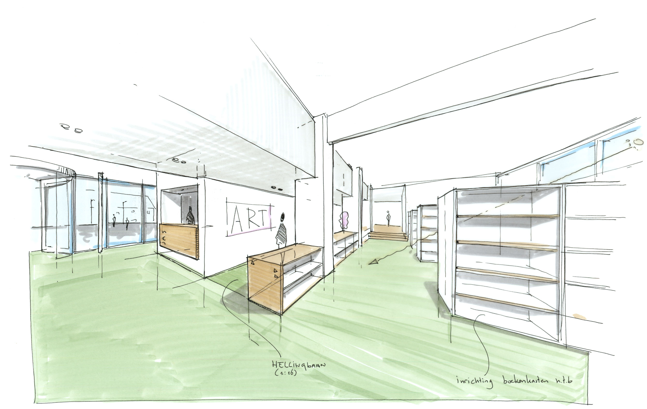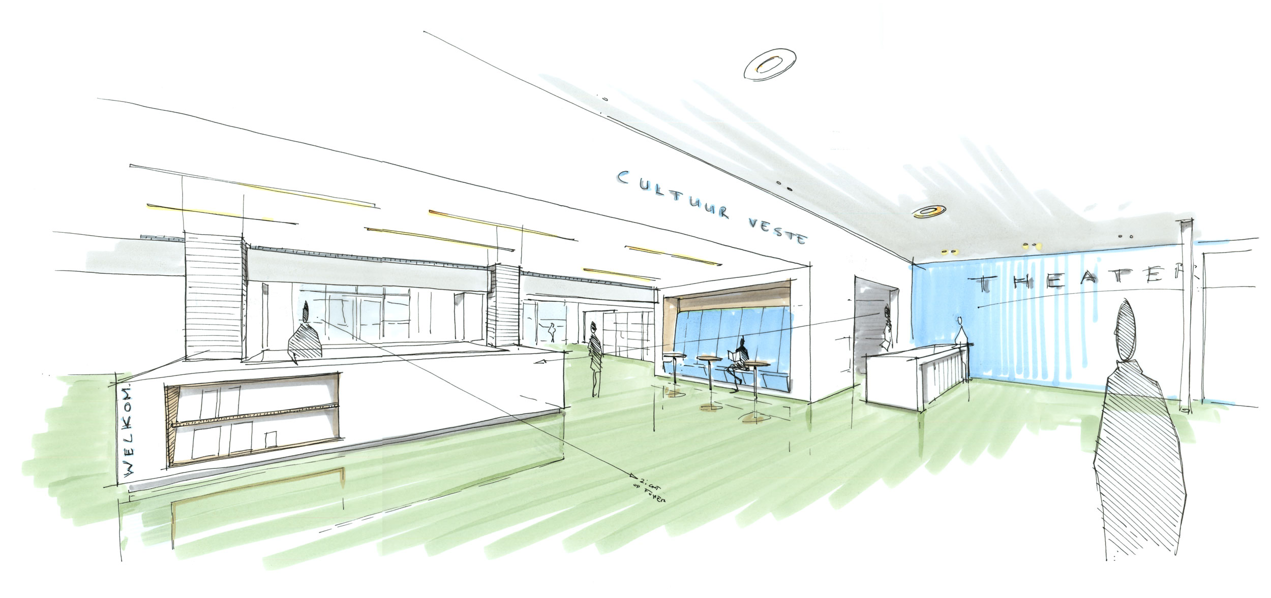 Door de foyer van het theater en de ruimten van de bibliotheek te combineren, vindt samensmelting plaats van deze twee gebruikers. In deze ruimte is overzichtelijk plaats voor een centraal gelegen balie, opstellingen van boekenkasten, theaterfoyer met leescafe en diverse lees-en luisterplekken.
