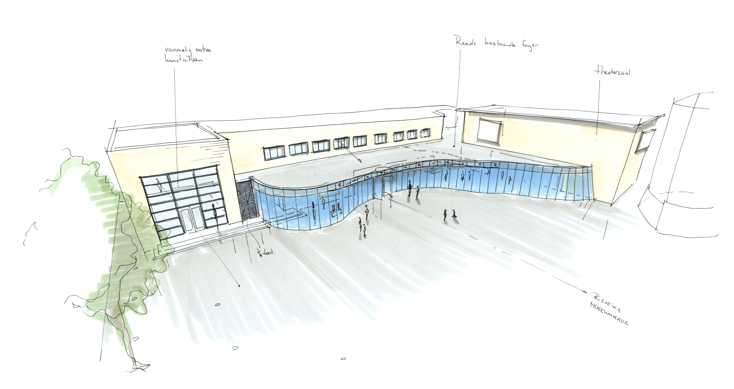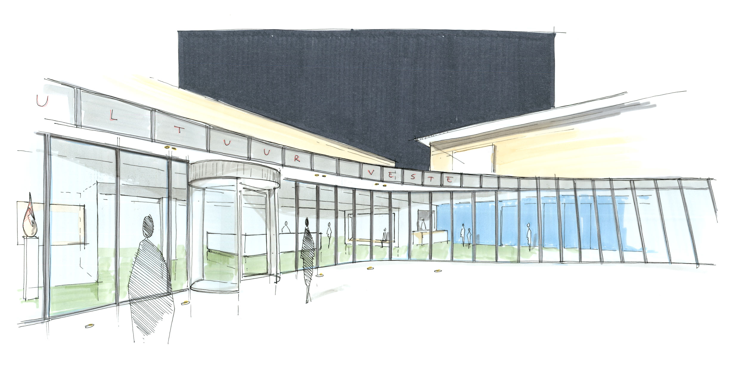 Langs de voorzijde van het gebouw zal de glazen vliesgevel als een (theater)gordijn voor het gebouw worden langsgetrokken. De entree van het nieuwe Cultuurhuis wordt gemarkeerd door een tourniquet onder een royale luifel. De hoofdentree ligt aan het einde van de as tussen het Cultuurhuis en de Museumkade met de historie van de scheepvaart.