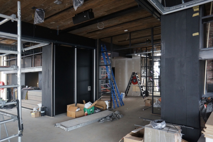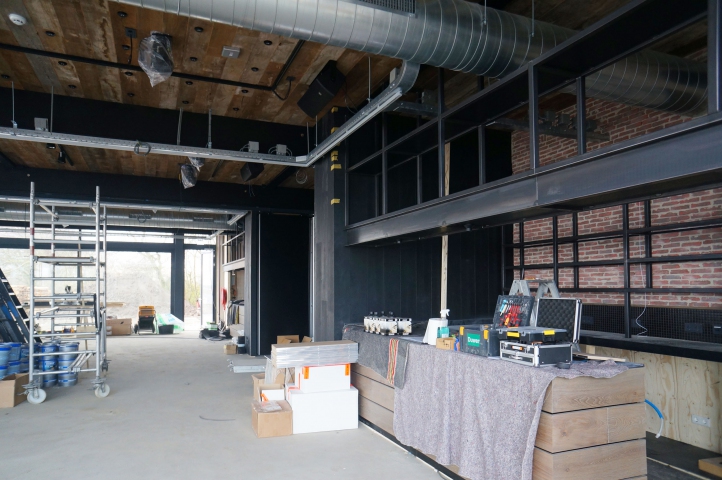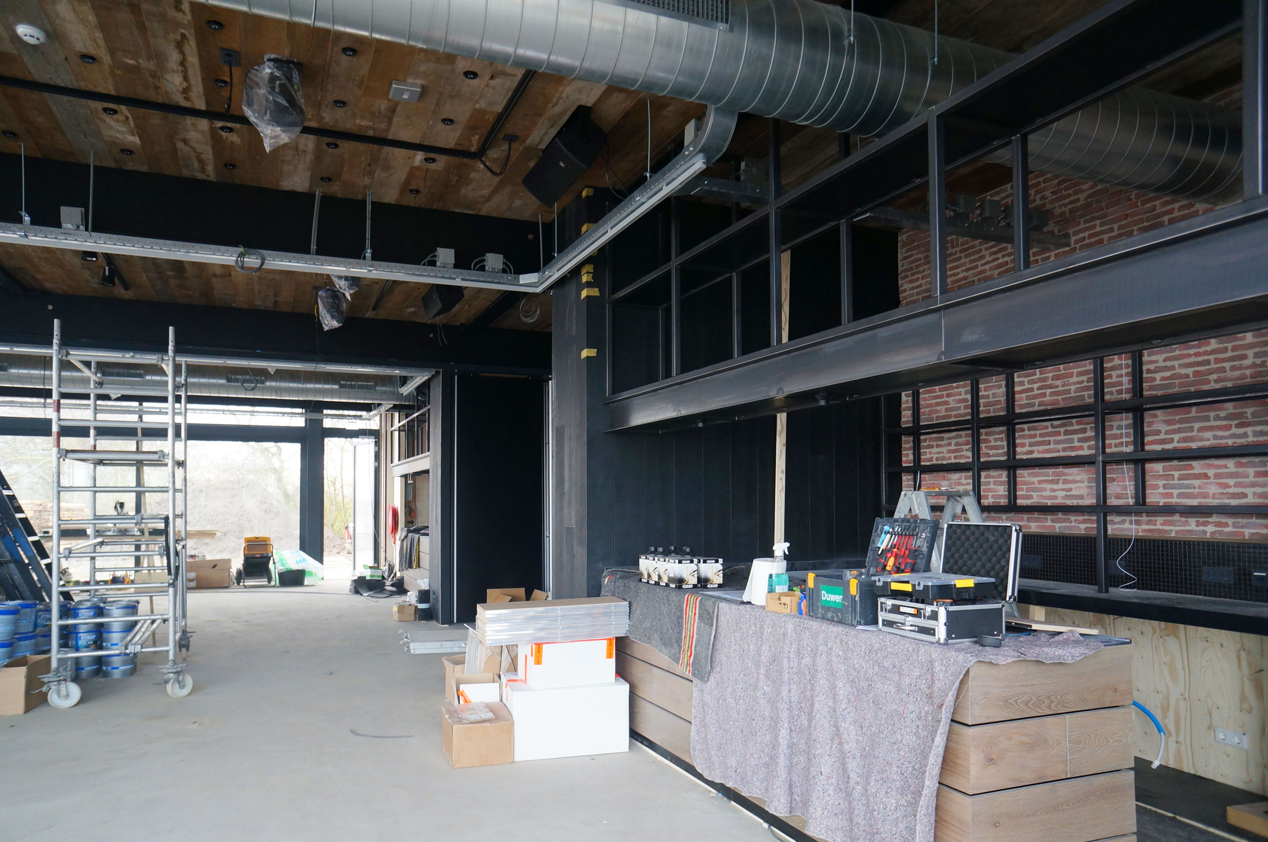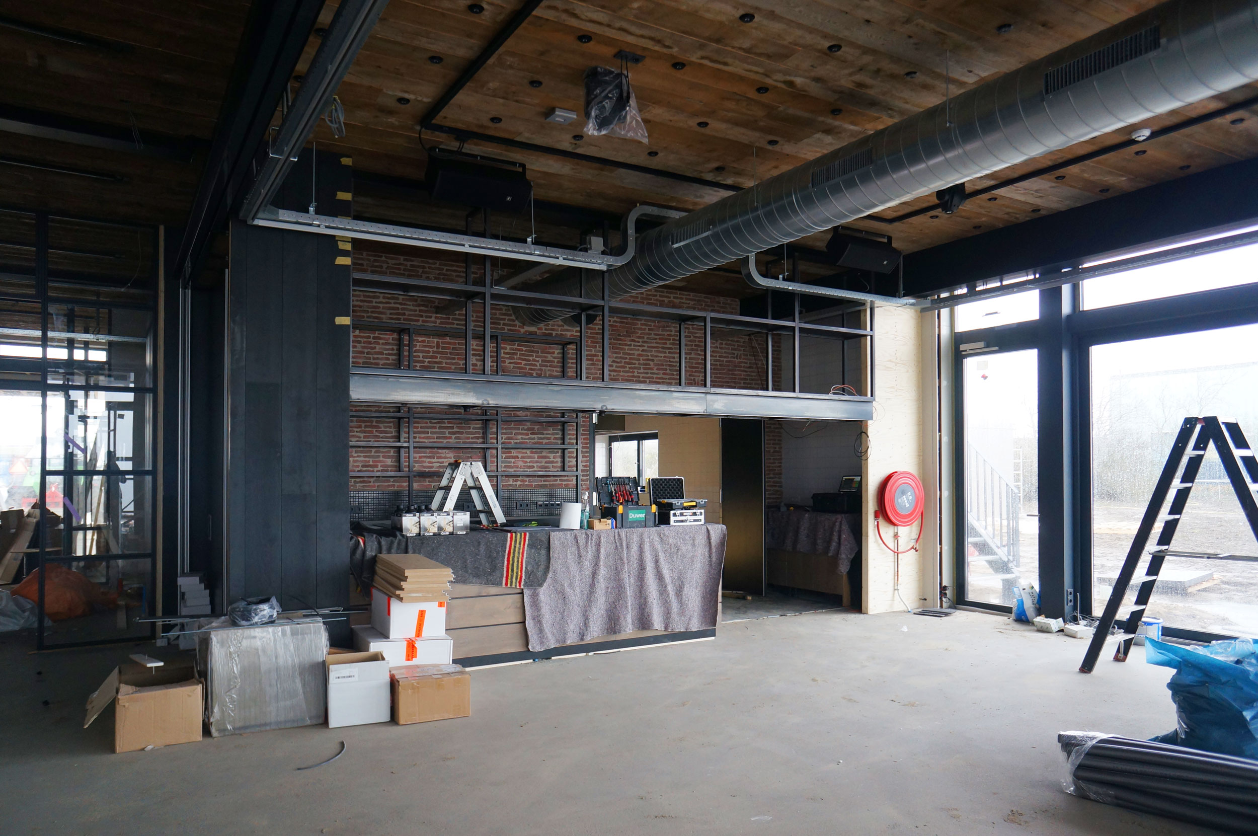 De laatste handelingen worden verricht aan de buitenbeplating. Aan de binnenkant is de uiteindelijke afwerking al zichtbaar. Het houten plafond, de zwarte wandbetimmeringen en de stoere bar-elementen zijn al geplaatst.