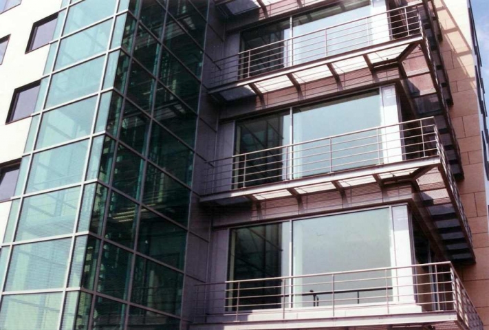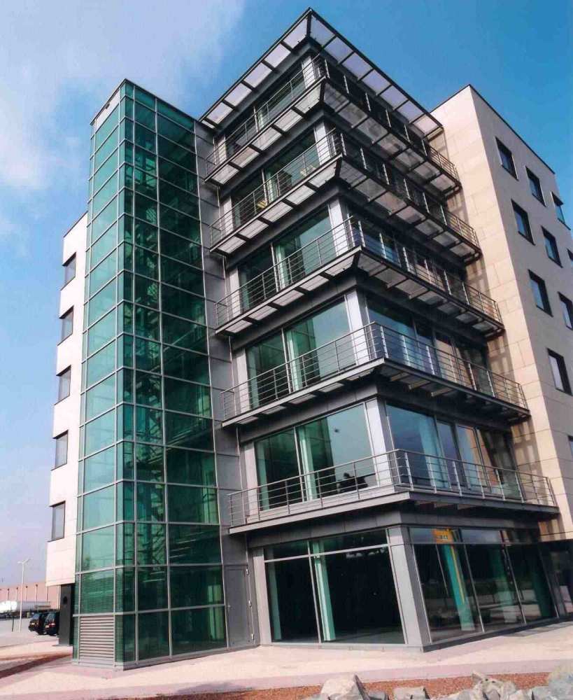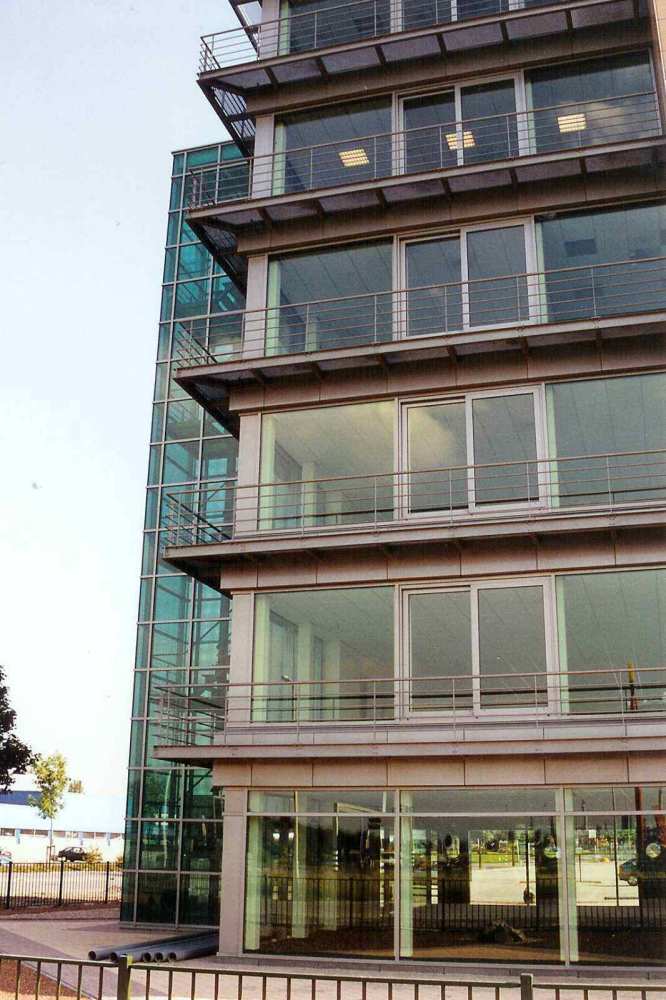 De open geveldelen zijn uitgevoerd in grijze aluminium glaspuien met aluminium roosterbalkons die zowel als zeembalkons, vluchtweg en als zonwering dienen. De zesde verdieping waarin zich de directiekamer bevindt en die een groot dakterras heeft, is – aansluitend aan het trappenhuis – rondom voorzien van glazen puien. In verband met het invallend zonlicht zijn de glazen puien uitgevoerd met een gedeeltelijke borstwering en een luifel boven de hellende gevels. De glazen gevels zijn doorgetrokken tot in de techniekruimte boven op de zesde verdieping.