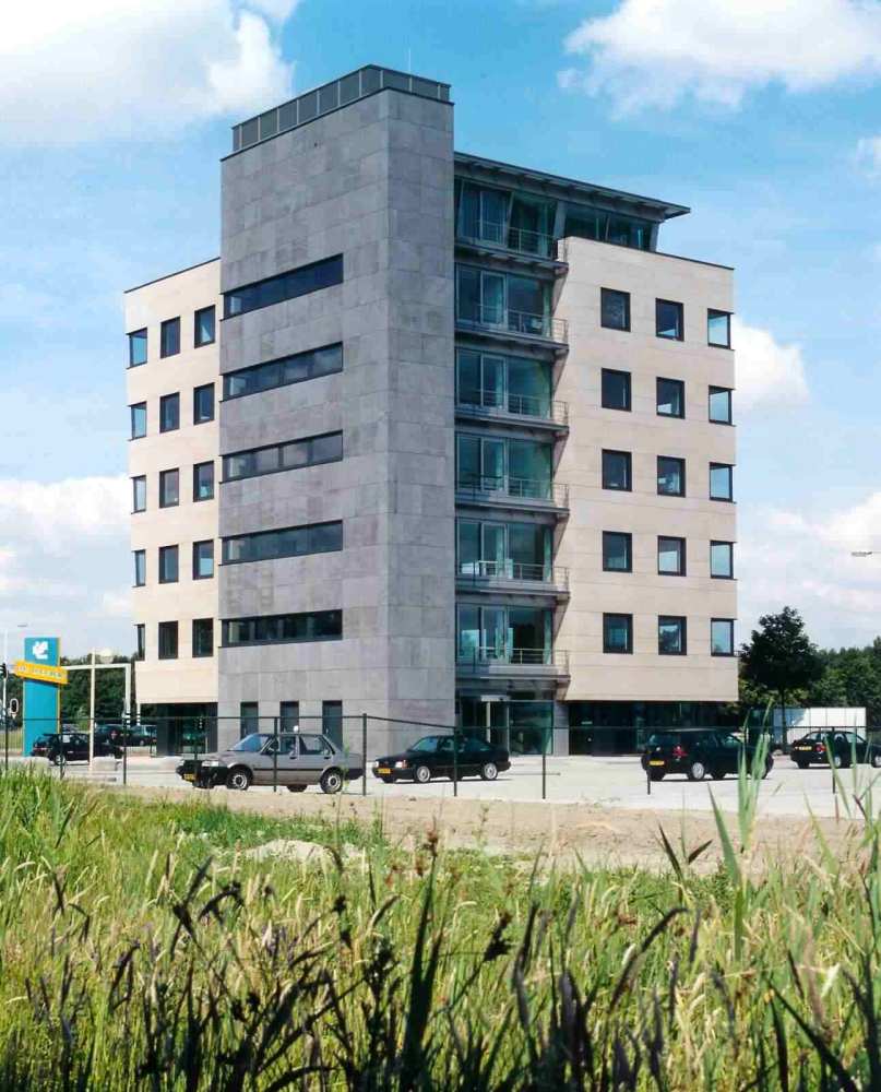 Alleen het natuurstenen geveldeel aan de noordzijde is hellend. Dit element accentueert en versterkt het slanke karakter van het ontworpen kantoorgebouw. Bovendien vormt het een tegenhanger voor het tamelijk massieve grijze trappenhuis aan de zuidzijde. Met de plaats van de open en gesloten geveldelen is ook rekening gehouden met de ligging ten opzichte van de zon: de gevels op het zuidoosten en zuidwesten zijn grotendeels gesloten in verband met invallend zonlicht.