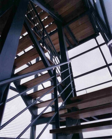 De centrale ligging van de kantoorruimten versterkt nog die rondgaande beweging. Dit is in iedere gevel zichtbaar. Gebruikelijker is immers om het trappenhuis en de liftkoker centraal in het ontwerp op te nemen. Ook hiervoor werd een andere oplossing gekozen. Het trappenhuis met de liften is tegen het vierkante gebouw ‘aangeplakt’ aan de minst interessante zijde van het gebouw, namelijk daar waar de nabije loodsen staan. De meest opvallende zijde van het gebouw bevindt zich echter aan de Groene Kruisweg en dus is daar ook het opvallende noodtrappenhuis gesitueerd: Een glazen koker met gezeefdrukt glas om de lichtinval te temperen.