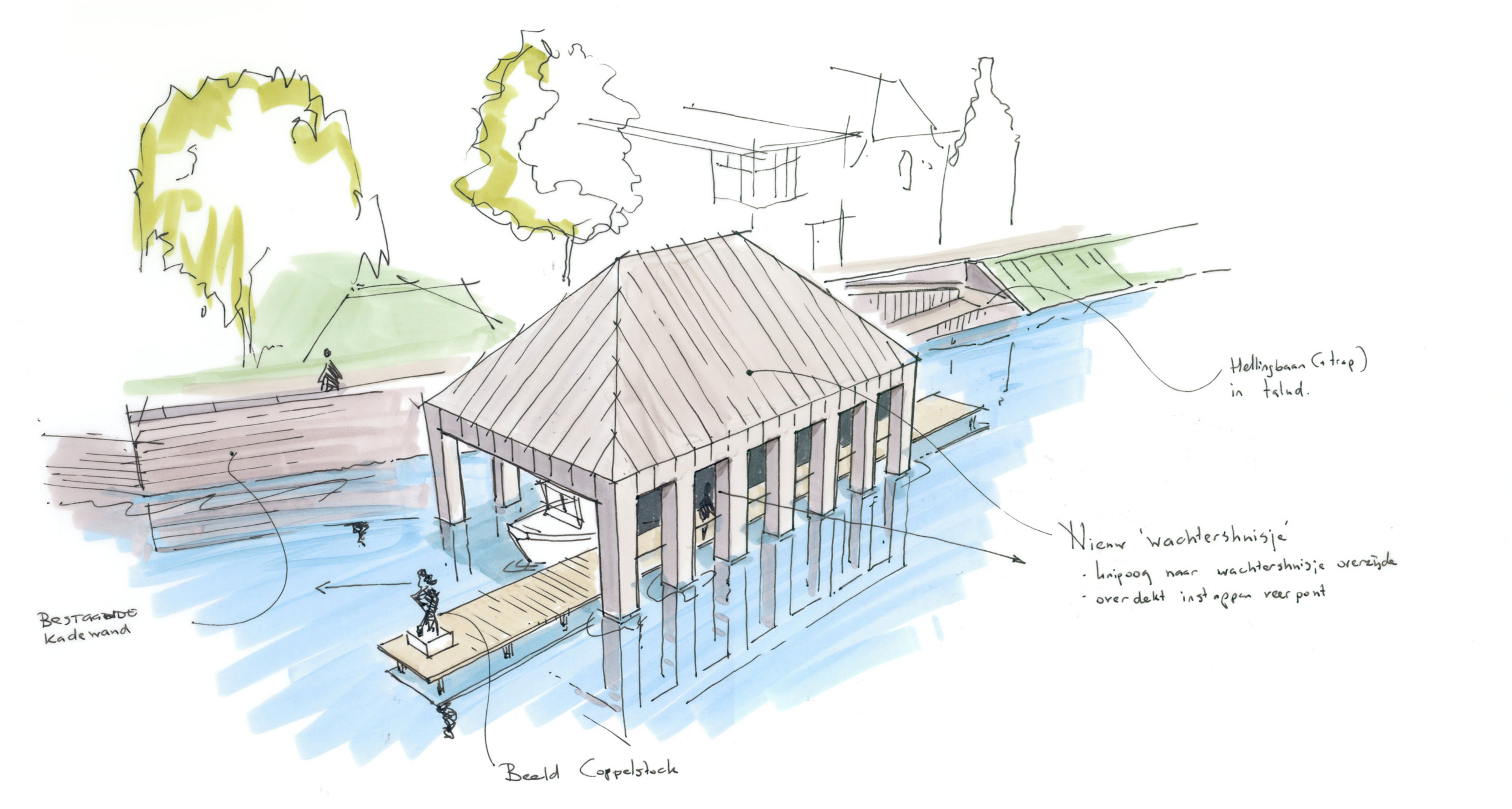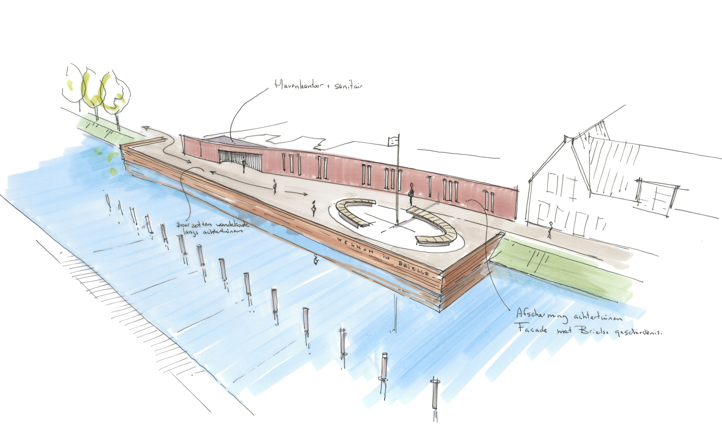 Er komt een ruime opstelplaats voor (elektrische) fietsen met een oplaadpunt. Via een toegankelijke hellingbaan bereiken mensen een modern zinken wachtershuisje dat een knipoog is naar het tegenoverliggende historische wachtershuis. Heden en verleden komen hier samen. Het standbeeld van Coppelstock krijgt een prominente plek op de steiger vanwaar hij goed uit kan kijken op de Brielse Maas, richting zee.