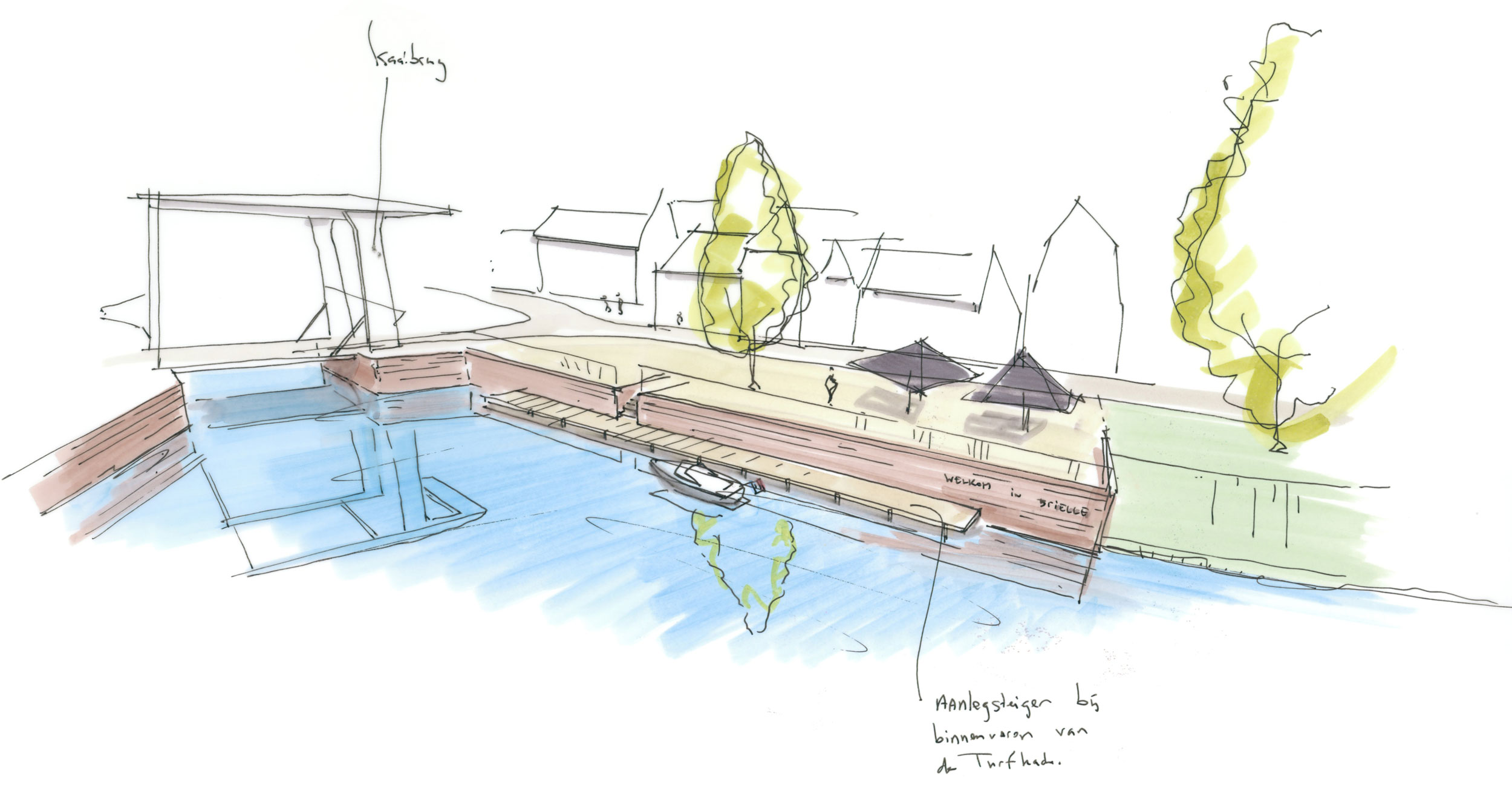 Hoe kunnen we het water weer meer bij de stad betrekken? Door de haven toegankelijker te maken voor dagbezoek en voor bootverhuur, door de kades te verlevendigen en open te stellen voor voetgangers en door doorgaande wandelroutes langs en op het water te maken. De waterkanten krijgen verschillende bestemmingen: veerhaven, terrashaven en expohaven, met elk een eigen karakter. Deze visieschets geeft aan hoe Brielle er uit kan zien als we het water weer een hoofdrol in de stad laten spelen.