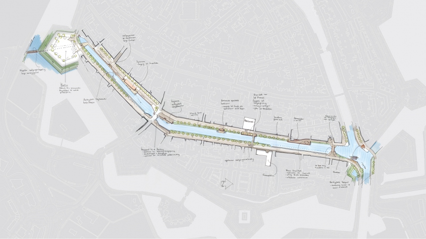 Ook op de oevers overheerst een gevoel van stilstand: geparkeerde auto’s hebben het beste uitzicht op het water. Voetgangers zijn veelal gedwongen om aan de kant van de bebouwing op smalle stoepen te lopen. Terrasjes zijn her en der op een hoek of tussen de geparkeerde auto’s gepropt. De ruimte op en rond het water oogt rommelig; er gaat weinig aantrekkingskracht van uit. Zo goed bewaard als de vesting is, en zo fraai geconserveerd als de vele rijksmonumenten, zo veronachtzaamd is het water. Alsof het water niet meer bij de stad hoort.