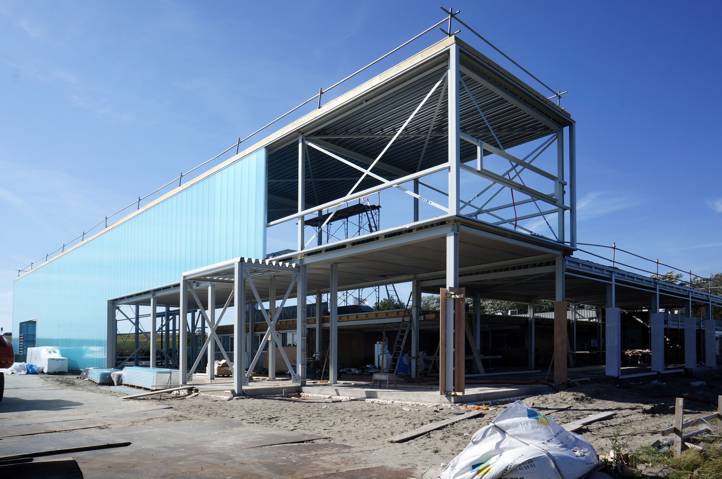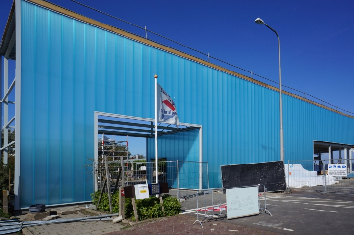 De gevelpanelen voor het nieuwe restaurant Zoet of Zout aan het Haringvliet worden gemonteerd. Ten tijde van de bouwvak wordt het ca. 50 meter lange gebouw ingepakt met translucente gevelbekleding.