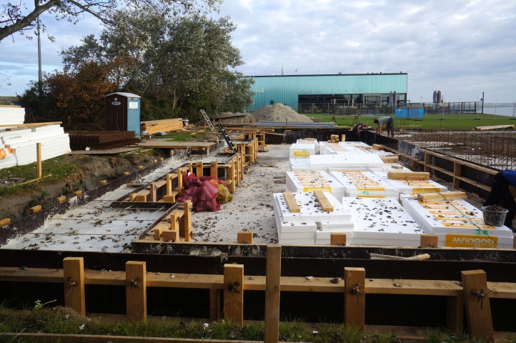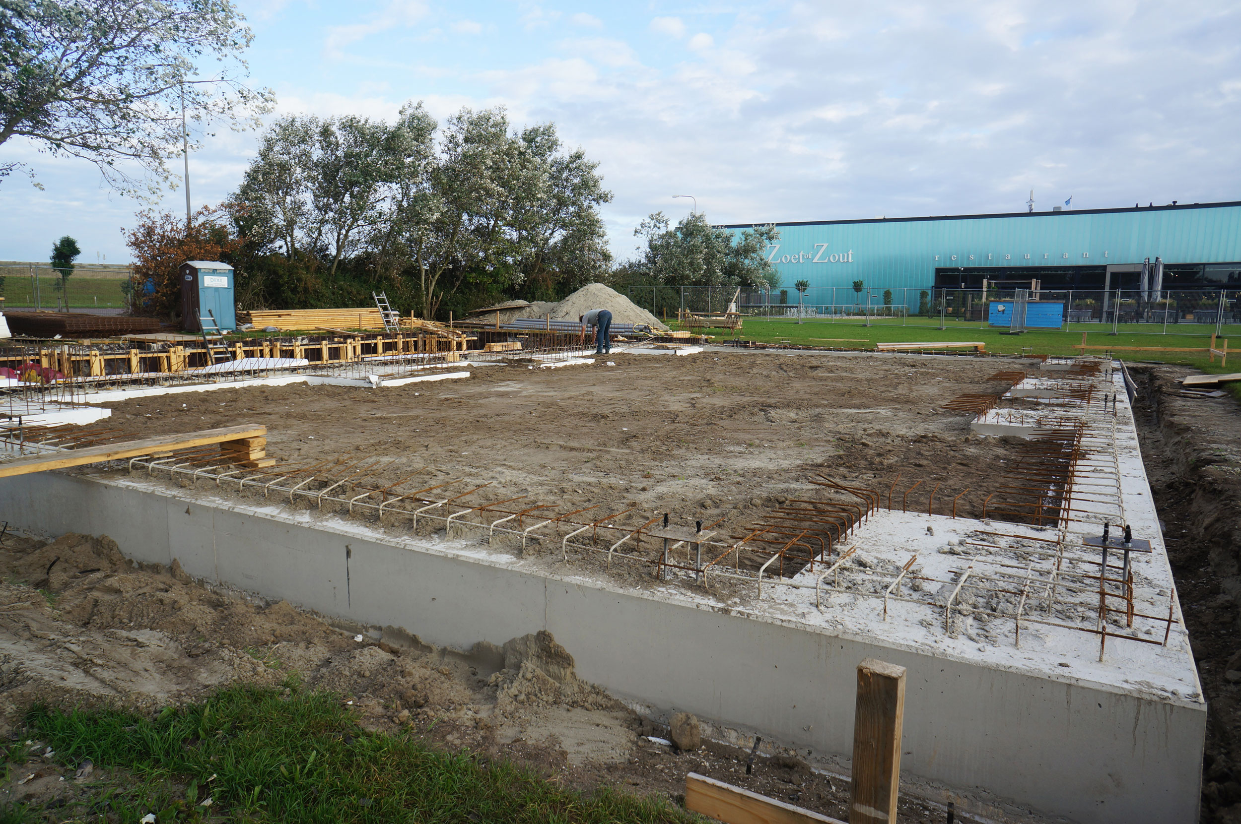 Stellendam - Bij het nieuwe evenementenpaviljoen wordt hard gewerkt. De complete fundatie, incl. installatiekelder, is gestort en is klaar om te ontkisten. Hierna worden er twee verschillende soorten begane-grond-typen toegepast; een vloer welke in het werk met beton wordt gestort én een prefab vervaardigd gedeelte.