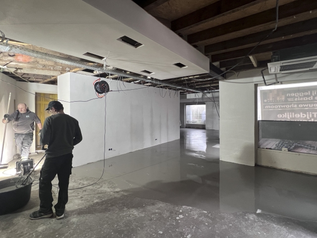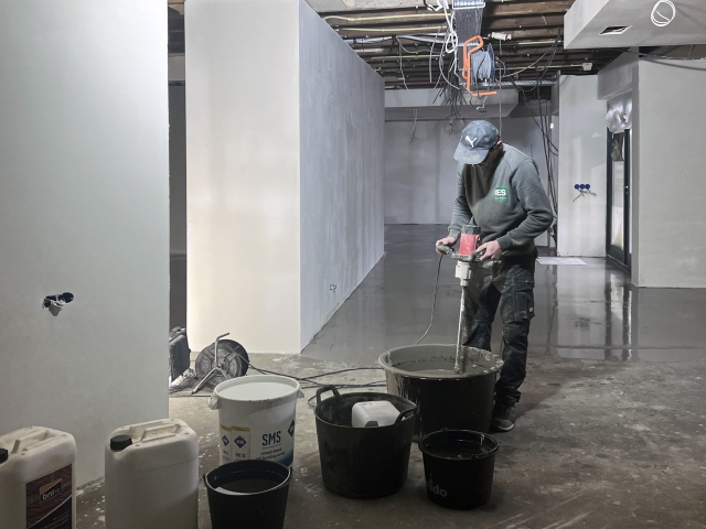 Hellevoetsluis - De werkzaamheden gaan snel bij de nieuwe showroom voor Van Son Vloeren. De voormalig winkel is begin december gestript. De aannemer heeft alle nieuwe (voorzet)wanden geplaatst en de stucadoor is gereed. De vele hoogteverschillen in het pand zijn verdwenen door een nieuwe afwerkvloer, welke momenteel wordt geëgaliseerd.