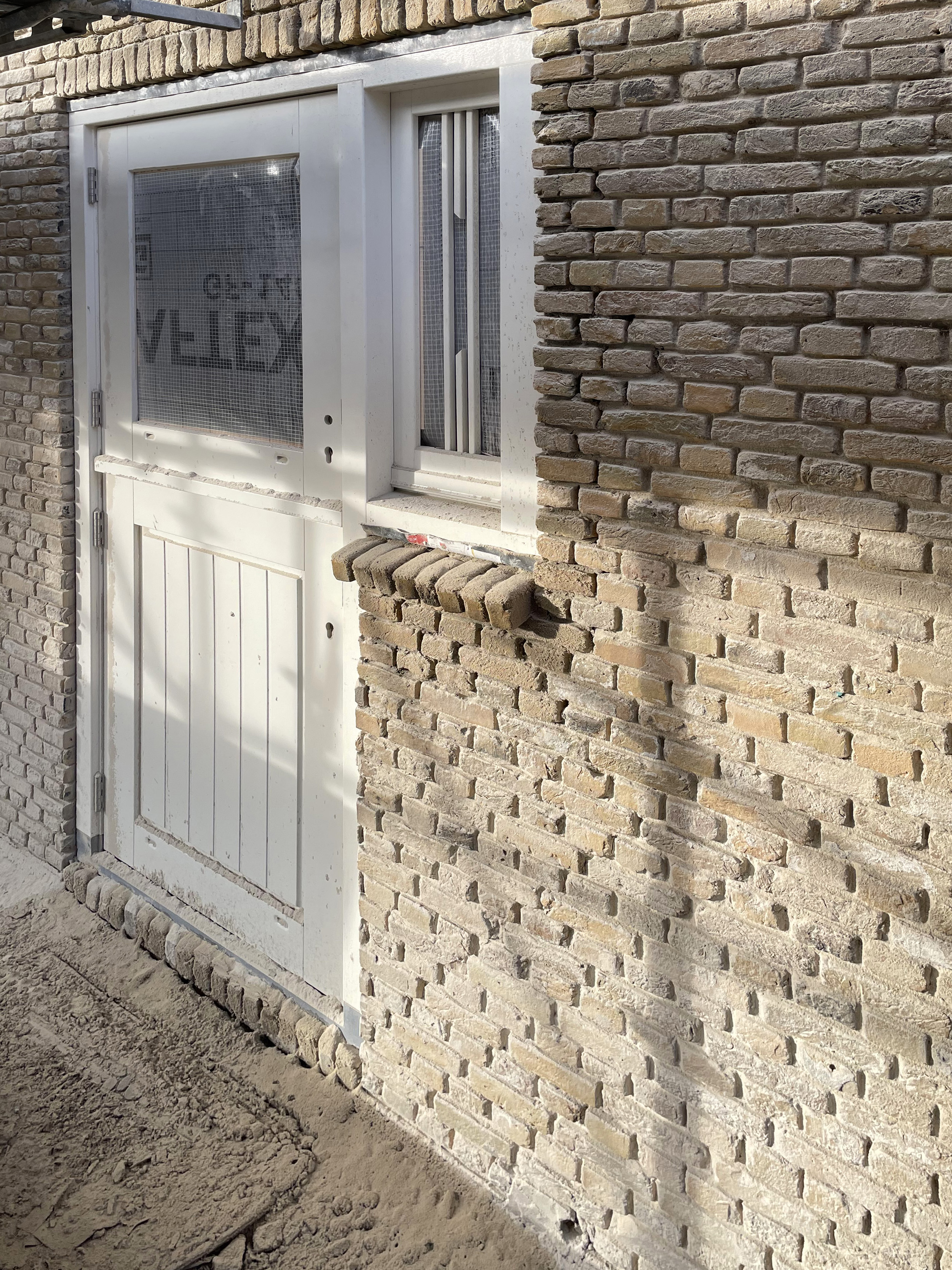 Rockanje - De verbouwing van deze duinboerderij is in volle gang. De kapconstructie is geplaatst en de woning is bijna wind en waterdicht. De dakpannen zijn uitgelegd en worden in de komende dagen op het dak geplaatst. Het metselwerk van de bestaande woning is hersteld en schoongemaakt. Binnenkort wordt ook het voegwerk aangebracht. Op de gevel van het nieuwe bouwdeel worden de zwarte vlotdelen bevestigd. Met het voltooien van deze werkzaakheden krijgt de woning haar uiteindelijke verschijningsvorm.