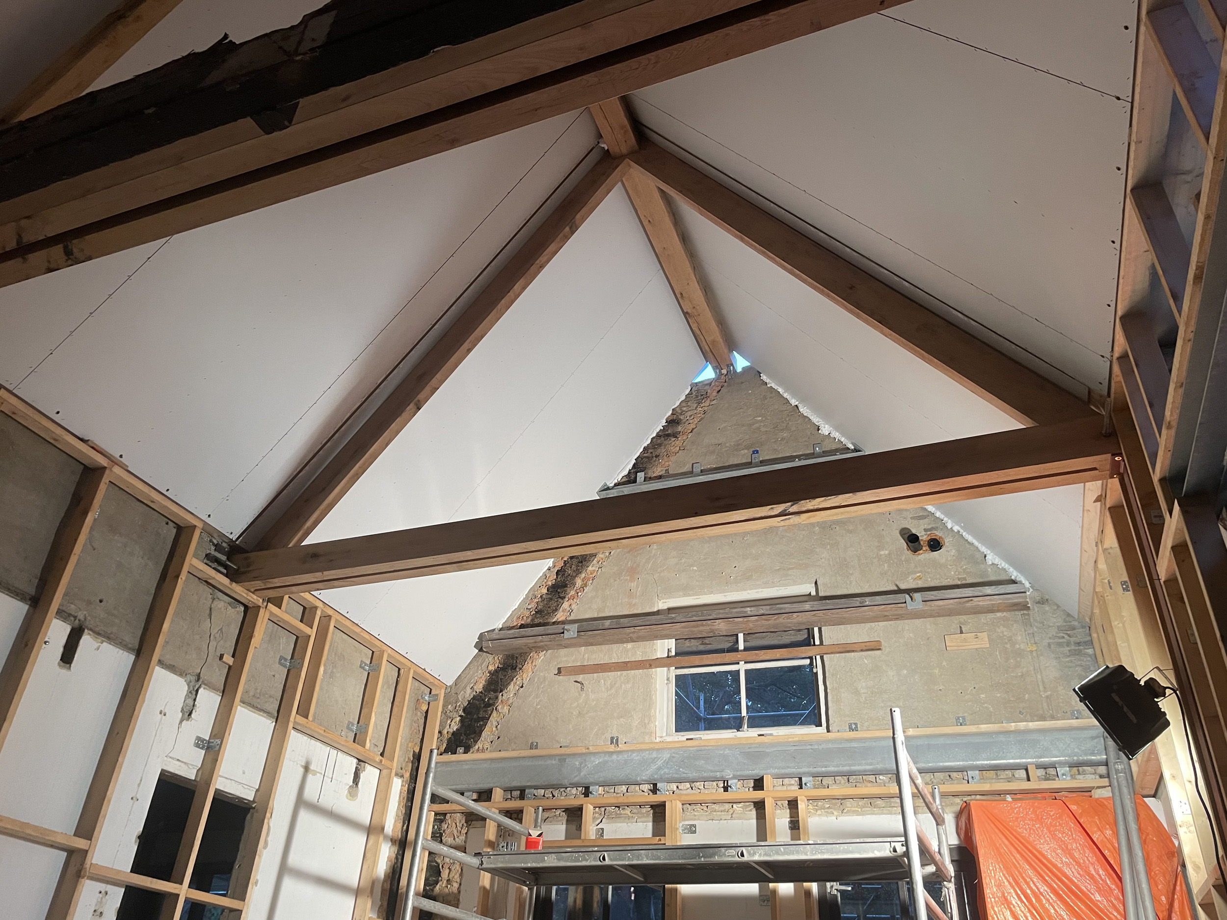 In de woning is gestart met het aanbrengen van de plafonds, het stucwerk en al het tegelwerk. Binnenkort komen ook de trap en het sanitair. De bouw ligt op schema en de verwachtte oplevering is in mei 2024.