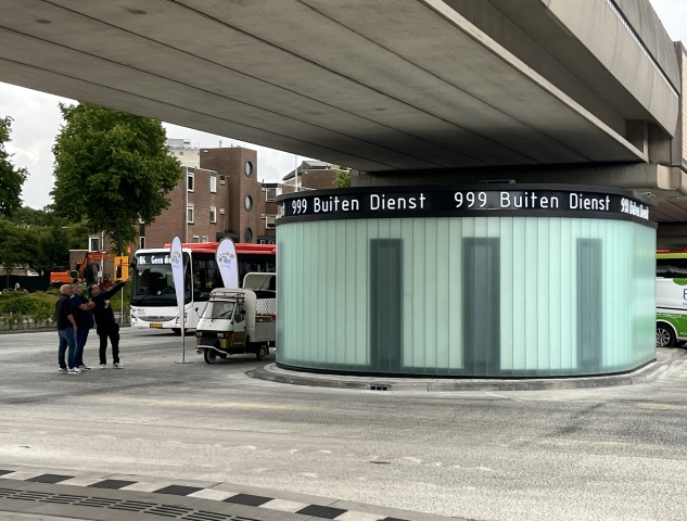 De paviljoenachtige wachtruimte voor de buschauffeurs staat centraal op het plein, waarbij de rijcurves van de bussen de ronde vorm van het paviljoen bepalen. Om voldoende privacy voor de pauzerende buschauffeurs te waarborgen is de buitenzijde voorzien van een semi-transparante glazen schil. De markante belettering '999 Buiten dienst' op de dakrand is een knipoog naar de buiten dienst vermelding op de buslijnen.