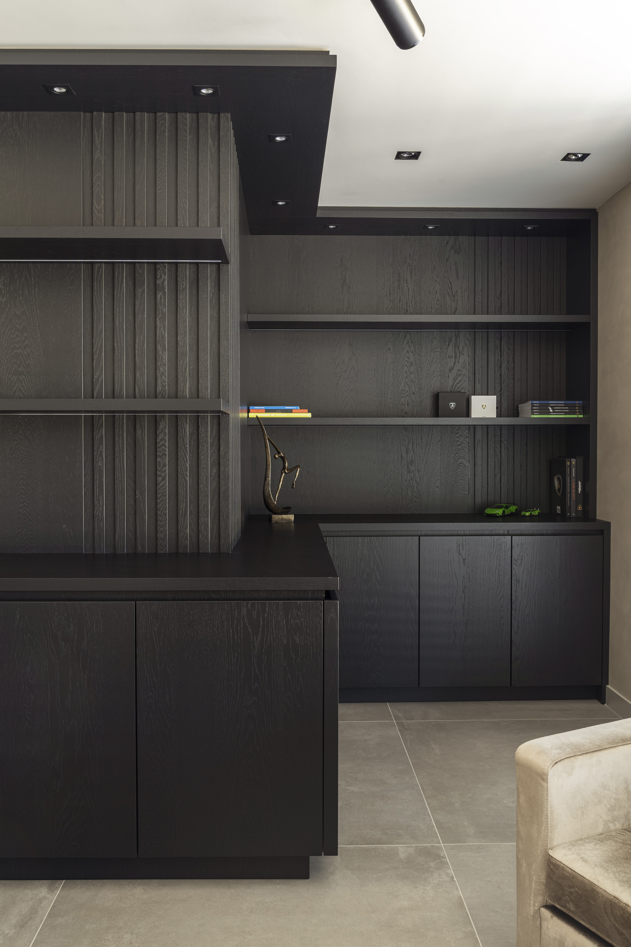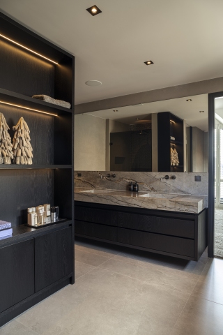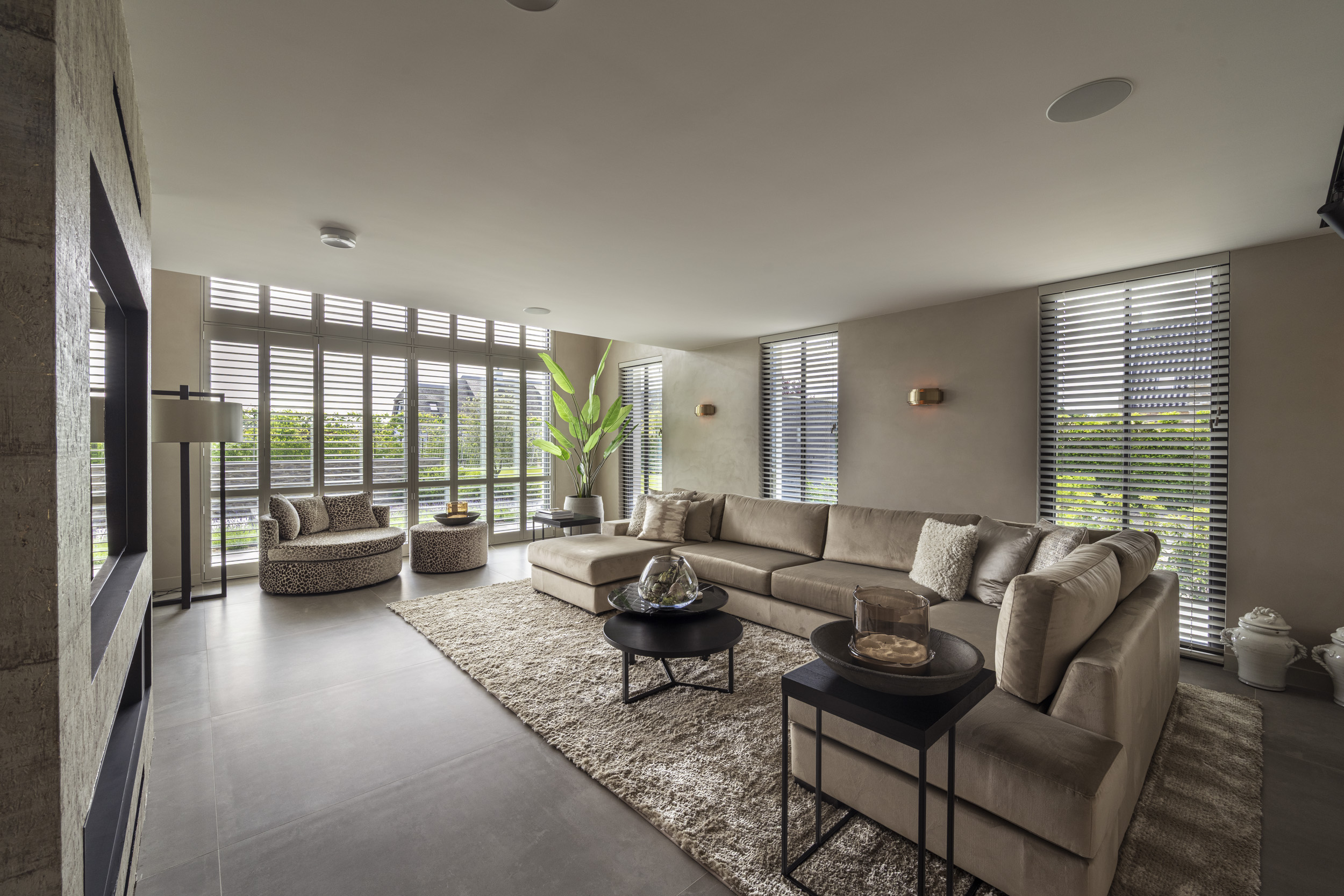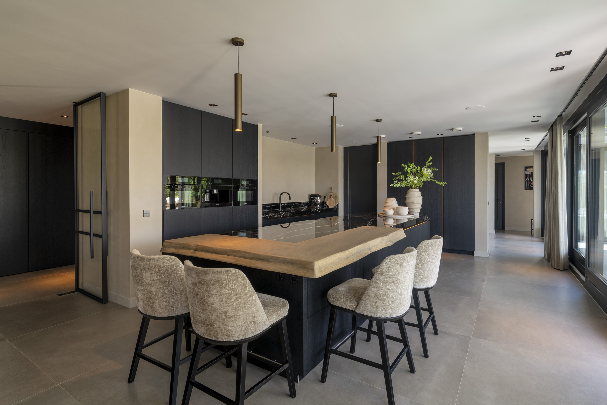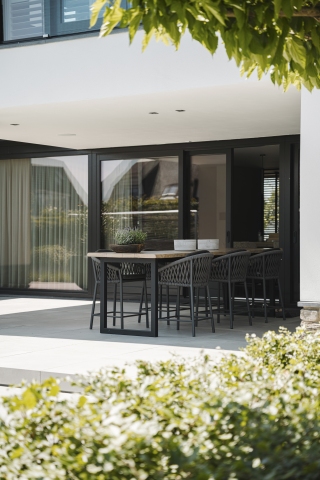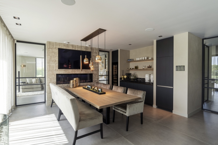 Vanuit de openbare weg oogt de woning ingetogen, terwijl de achterzijde een directe verbinding met de tuin biedt. Grote schuifpuien zorgen voor een vloeiende overgang tussen binnen en buiten. Ruime terrassen en een zwembad maken het woonplezier compleet.