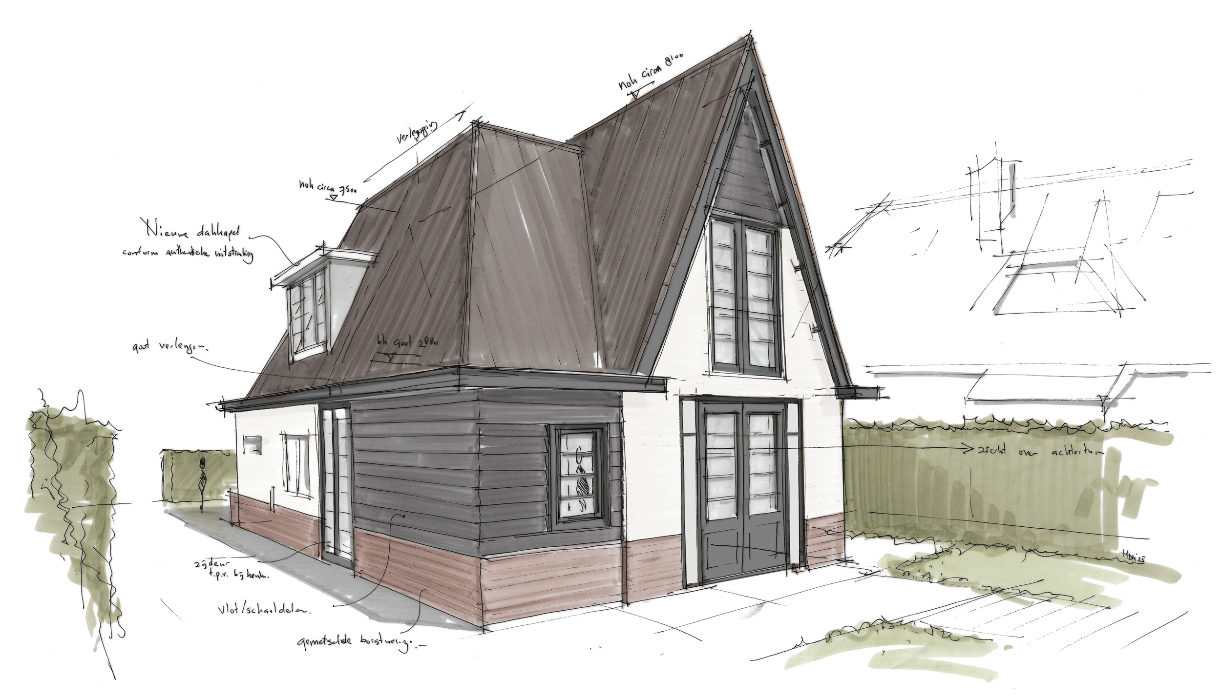 Het ontwerp sluit mooi aan bij de originele jaren ’30-stijl van de woning; de uitbreiding pakt de hellingshoeken, de bestaande goothoogten en materialisatie op, passend bij de uitstraling van het huis.