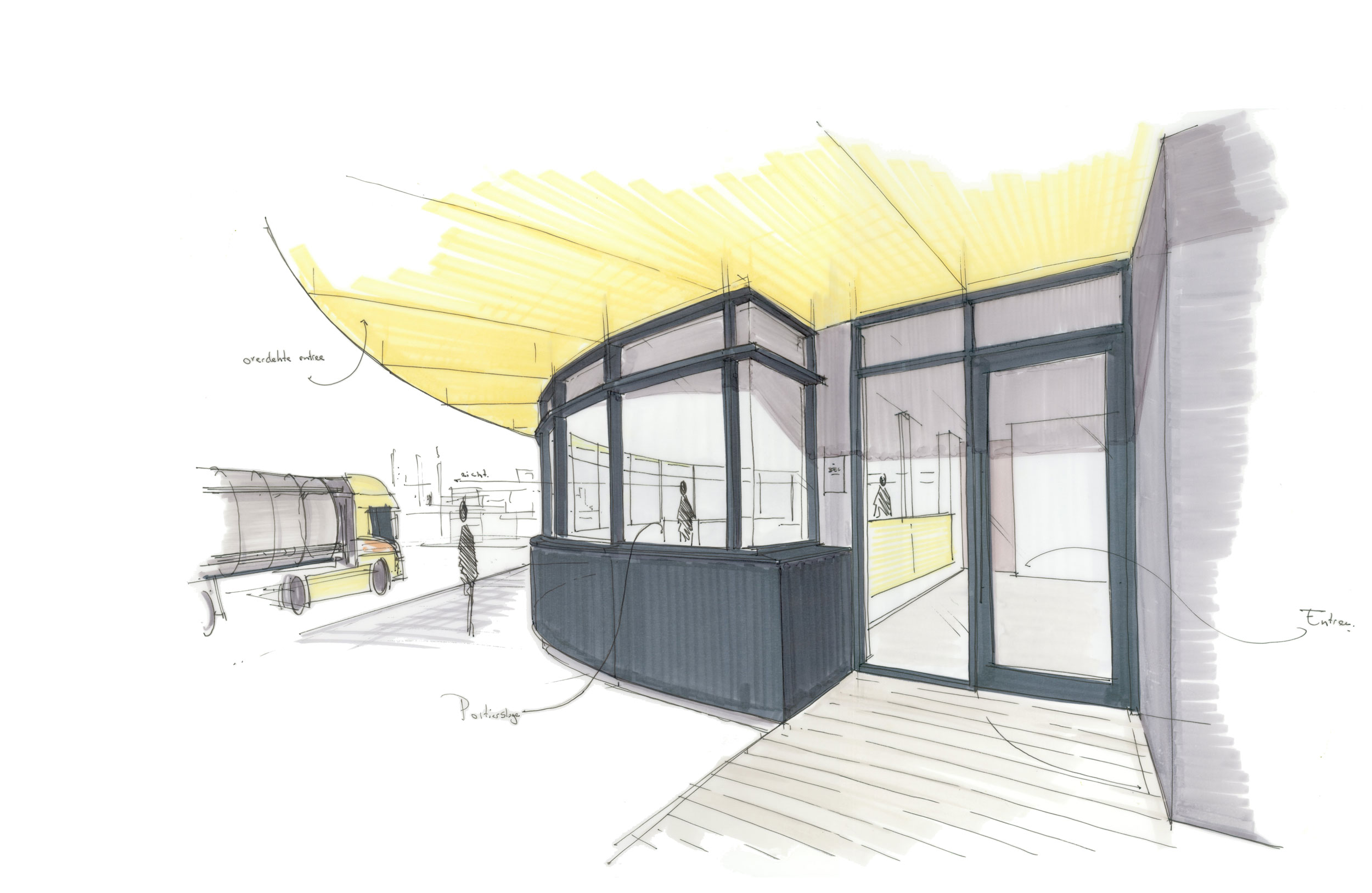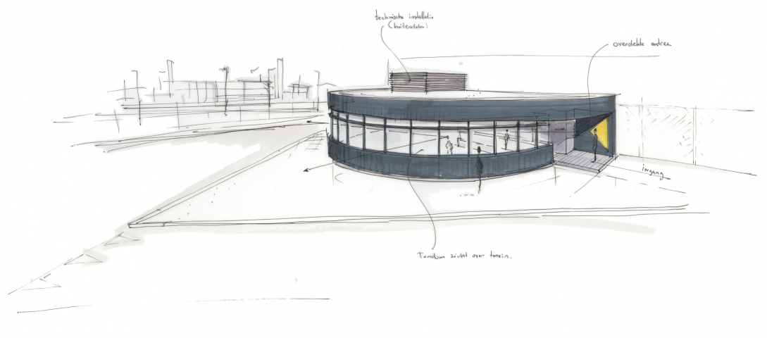 Daarnaast speelt de vorm van het gebouw in op de kenmerkende typologie van een portiersloge met een halfronde plattegrond, veel glas en een flinke luifel. Dit garandeert de juiste zichtlijnen voor de portiers van binnen naar buiten en andersom. De grote luifel werkt uitnodigend en weert bovendien de zon.