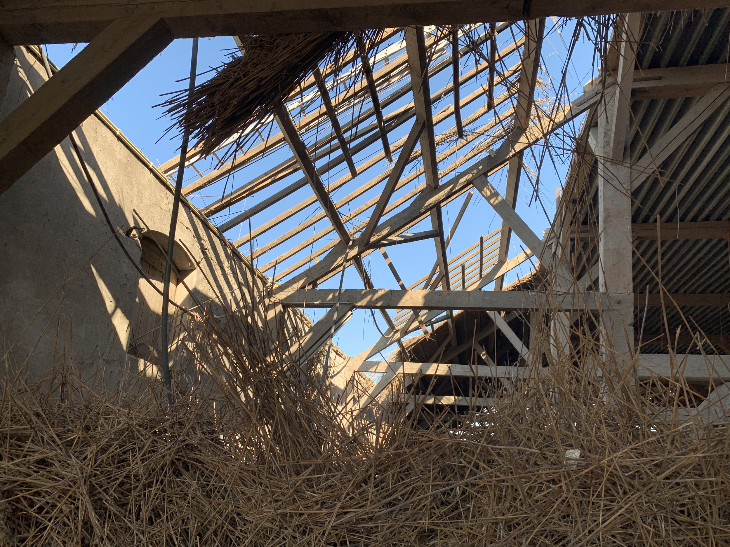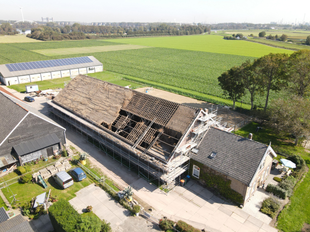 Zwartewaal - Het dak gaat eraf bij de transformatie van de monumentale schuur van boerderij 'De Onderneming' aan de Maasdijk. De bestaande dakopbouw wordt eerst volledig gestript tot de bestaande sporen, inclusief de laag riet onder de dakpannen. Hierna worden er nieuwe isolatiepanelen aangebracht en worden de oude dakpannen hergebruikt zodat de boerderij na een grondige verbouwing dienst kan gaan doen als educatieve bezoekboerderij.