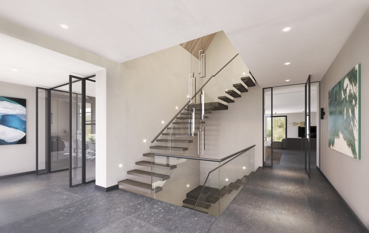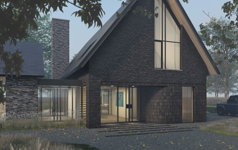 De nieuwbouw wordt gerealiseerd op de plek van de huidige woning, waardoor de bestaande bomen behouden blijven. De woning bestaat uit een hoofdgebouw en een ondergeschikt bouwdeel. Hierbij staat het hoofdvolume haaks op de weg, een oriëntatie die een knipoog geeft naar een historische positie van een bospad. Dit zorgt tevens voor een prachtig zicht op het voorliggende gebied.