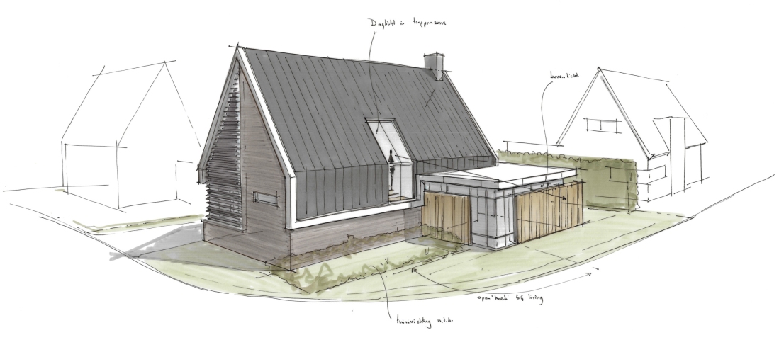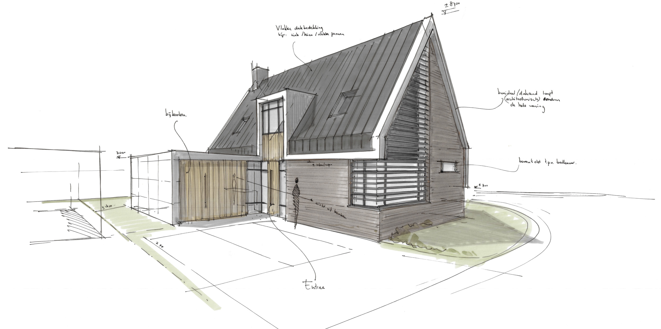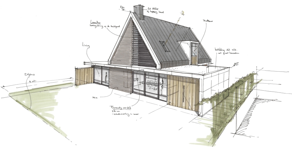Het ontwerp heeft de mogelijkheid dat er in de toekomst nog een veranda aangebouwd kan worden die zich voegt in het strakke lijnenspel van de woning.